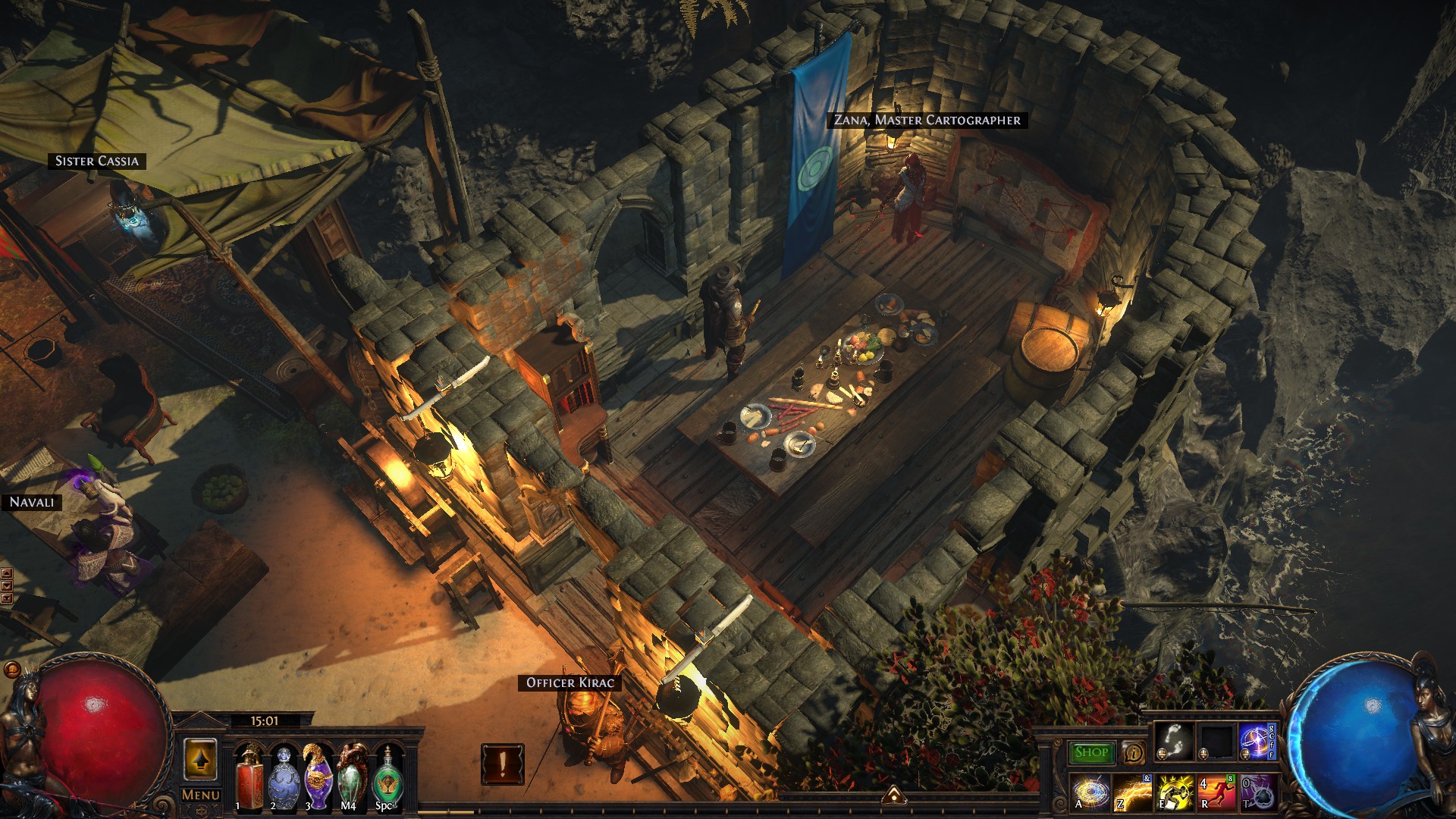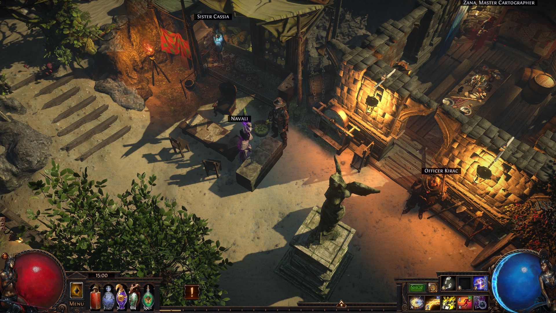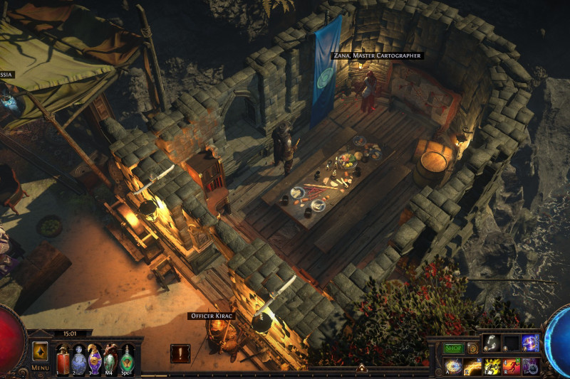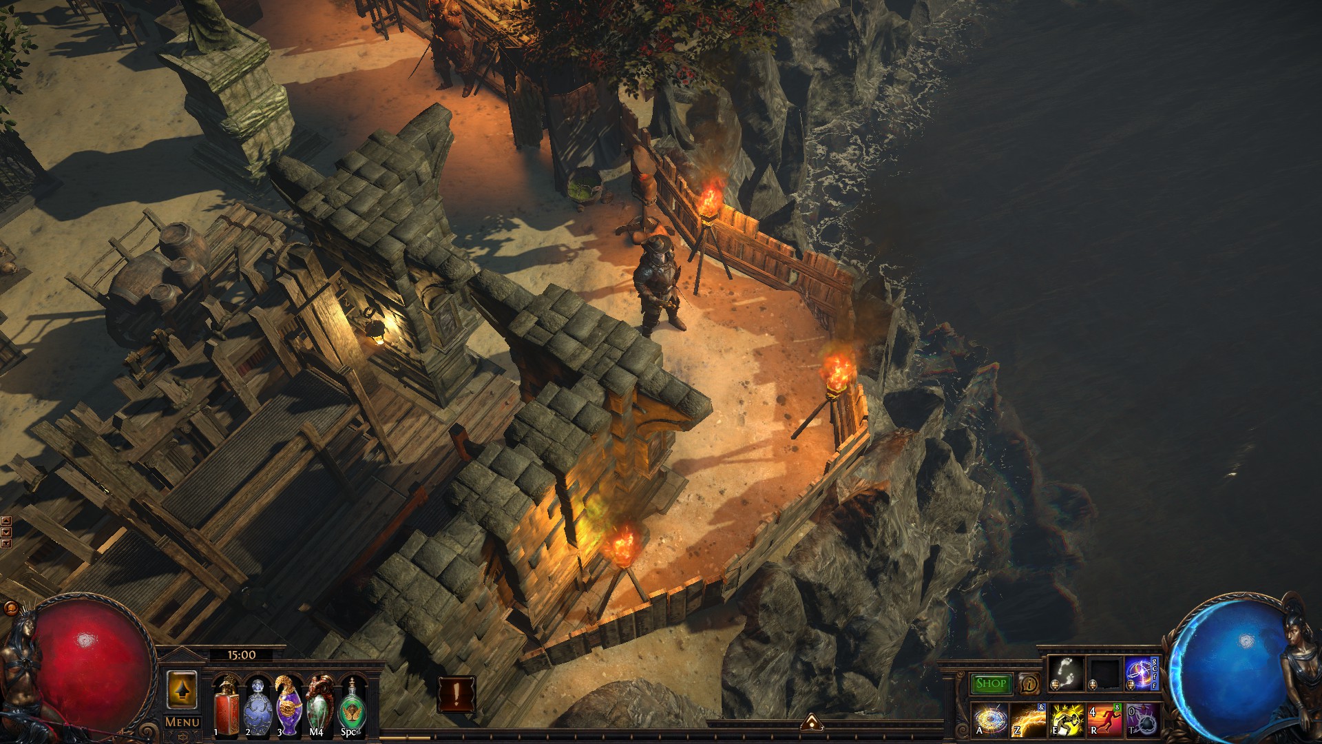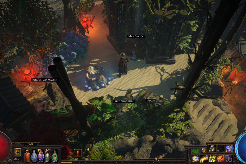 A small island that includes a port, a refuge for exiles with a marketplace, an uphill monastery with living quarters for the masters and the player, a banquet hall and a mystical garden with a device that is said to open the gate to other worlds...