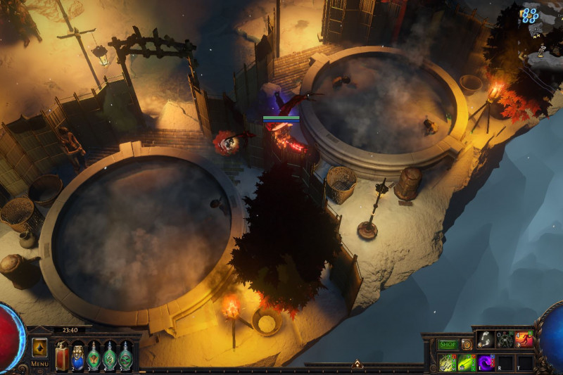 The outdoor hot springs area consists of four parts: a shrine area, the (natural and man-made) hot springs area, a small outdoor barbeque dining area, and a mining area that produces the minerals and materials required to power the man-made hot springs. This is also the area in which my map device, stashes and crafting table is located at.
