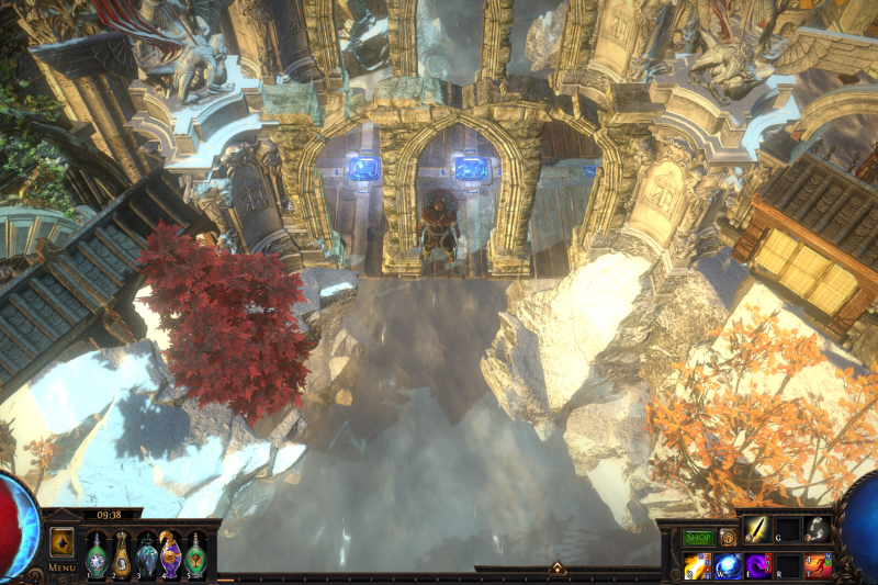The idea was to create a large building like structure themed to be in the heavens. I wanted to try keep it fairly clean, but also have some unique decorations at each area (Main map, Alva and Jun). In order to make it feel more like it was in the sky, I used the combination of the Boundless Sky hideout with Large Snow Rocks and Angelic Environmental effect (MTX) that covers certain bottom portions of the large snow rocks, giving more atmospheric depth perspective. Overall, I designed the portal effect to fit the default portal effect.