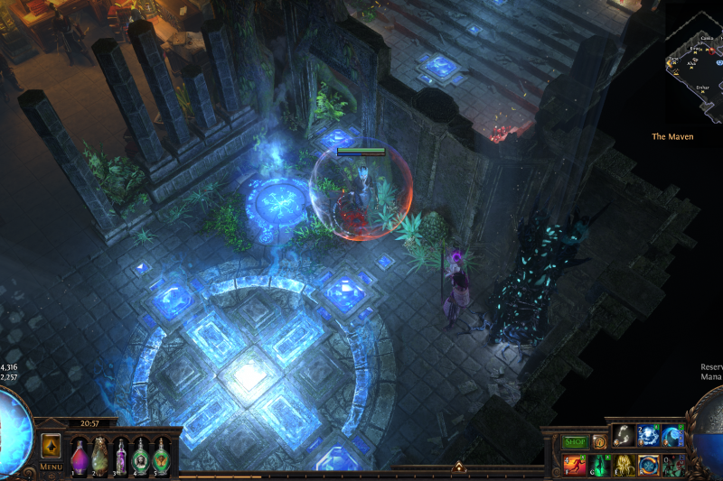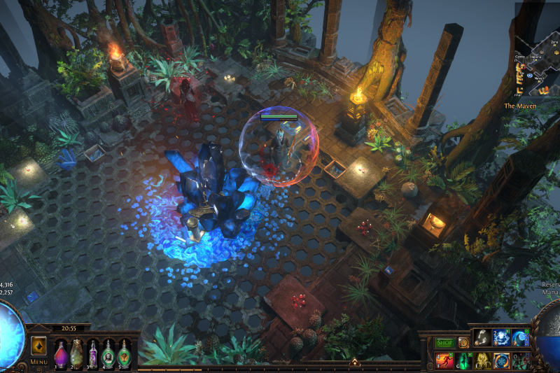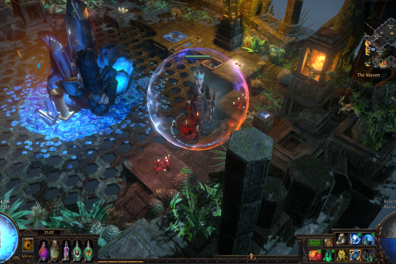 But having a companion like that, you need to provide a space that is at least as majestic as he is as well as cozy and a bit mysterious. Due to the fact that the primordial blocks are imbued with azurite veins and the precious life force that spawns beast-plants in Oshabi's sacred groves, the beautiful space in the mountains high above Wraeclast proved to be perfect: lush trees and all sorts of plants grow out of fertile stones (which in any other place would seem strange), the old structures radiate the harmony and steadyness of nature being in unity with man-made stones. Roots and branches of the ancient trees hold together the homely halls. Huge, sparkling azurite crystals not only provide the energy for the place but also show the surfacing magic inherent in this bizarre yet awesome landscape.