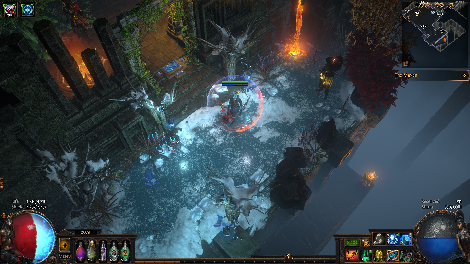 As this primeval hideout is located among the harsh peaks of high mountains, the outside areas are mostly glacial; snow-covered and icy but fortunately close to a magma vein that provides fire and warmth. I am only an apprentice, so I did not manage to fully get the place in shape. Down below, near the sacred circle where fusings for sixlinked items, fossil- and essence-craftings in addition to occult rituals take place, things are still messy. But dear reader, I've planted a magic seed in the middle of this protected space. So if you stay patient and tread lightly, maybe one day there will grow a beautiful magic tree...