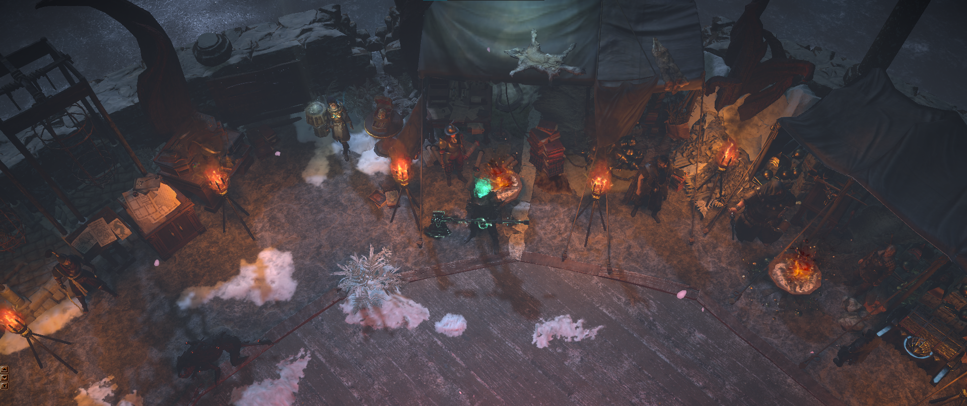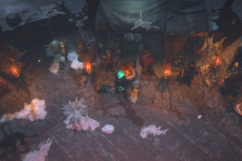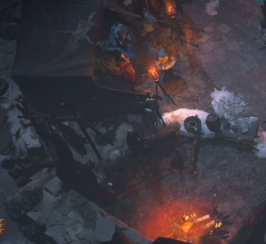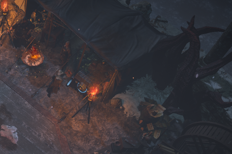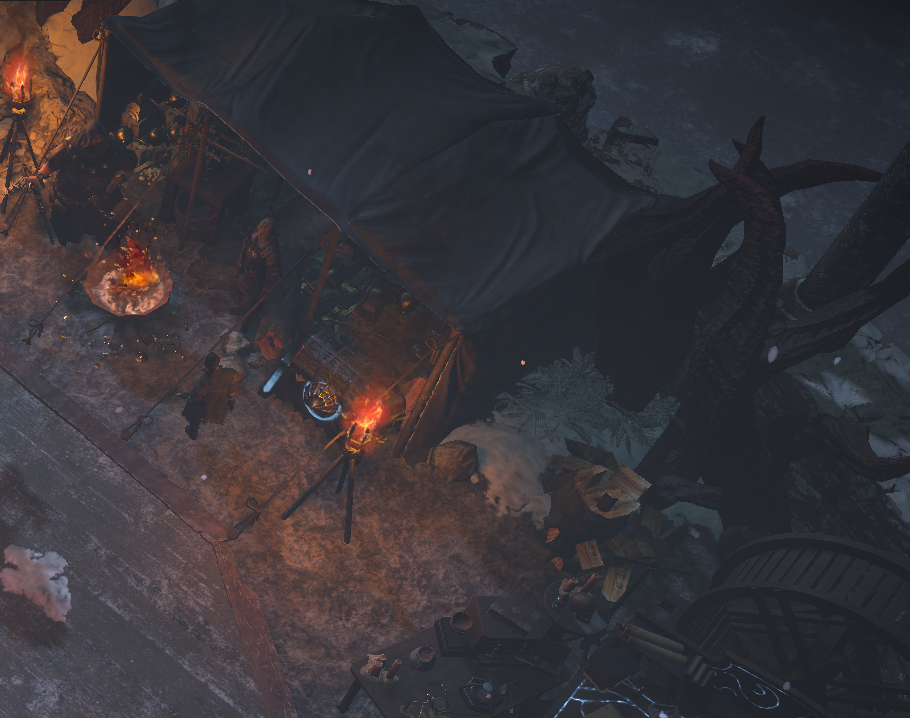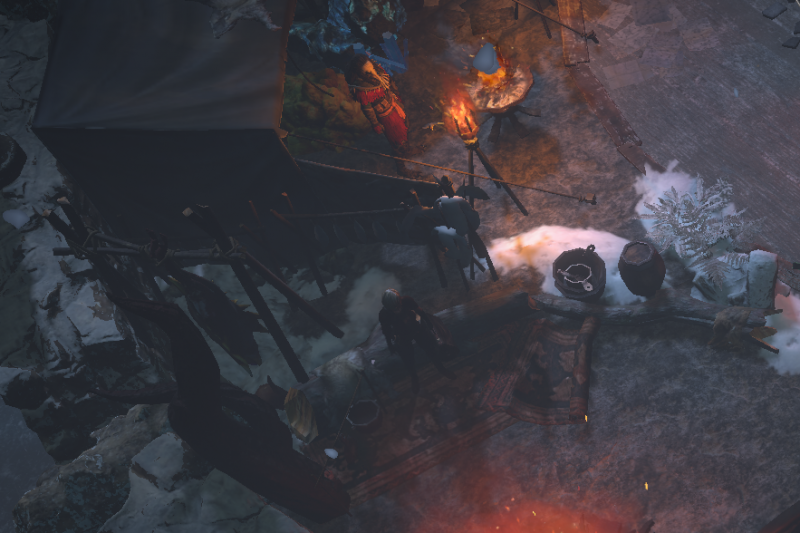 All NPCs available around the outer ring, and have their own related decorations placed nearby or inside their tents. (Niko is missing in the screenshot, but his placement is between Einhar and Kirac.) Ms. 'Hail Godslaya' is next to the stash to easily sell trash.