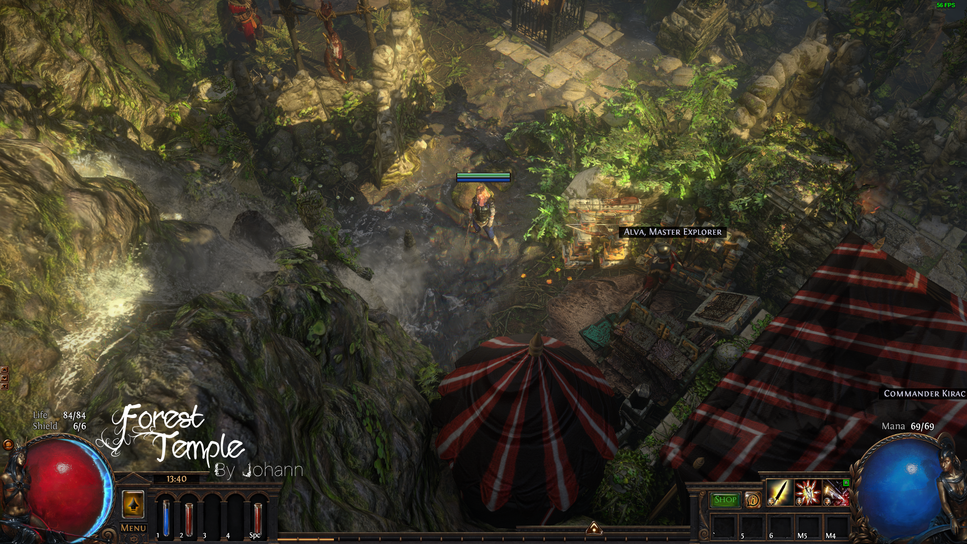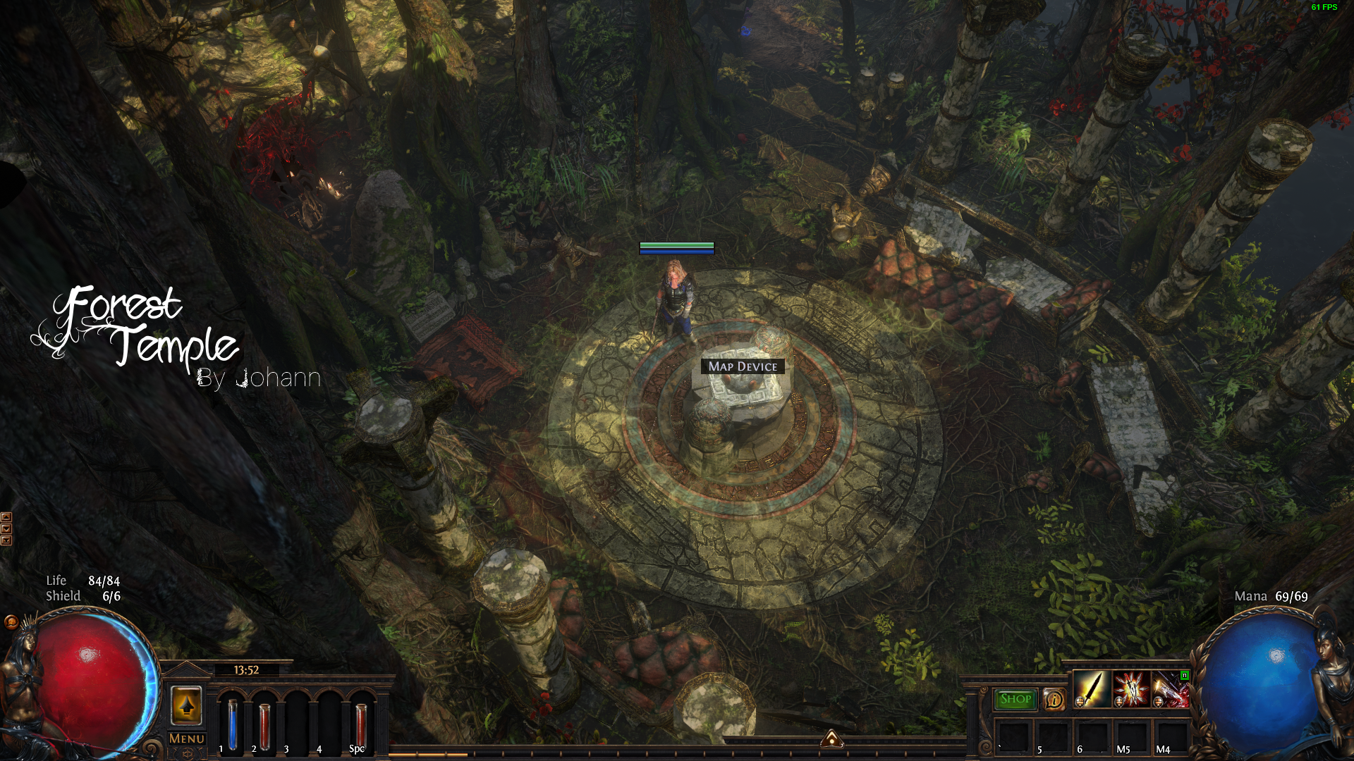 I had the idea of an ancient temple in the forest that Helena and Co found. She set up a small camp with her party to have a fortified location with a chokepoint. Eventually, rot took two trees down and formed a bridge of sorts. When she and the Nomad explored across the river, they found an old Vaal map device. Around the device were the ruins of a strange Staging Ground for the Atlas. The Nomad then set up a little tent near the map device and took the only unruined sofa-bed to keep an eye on the map device.