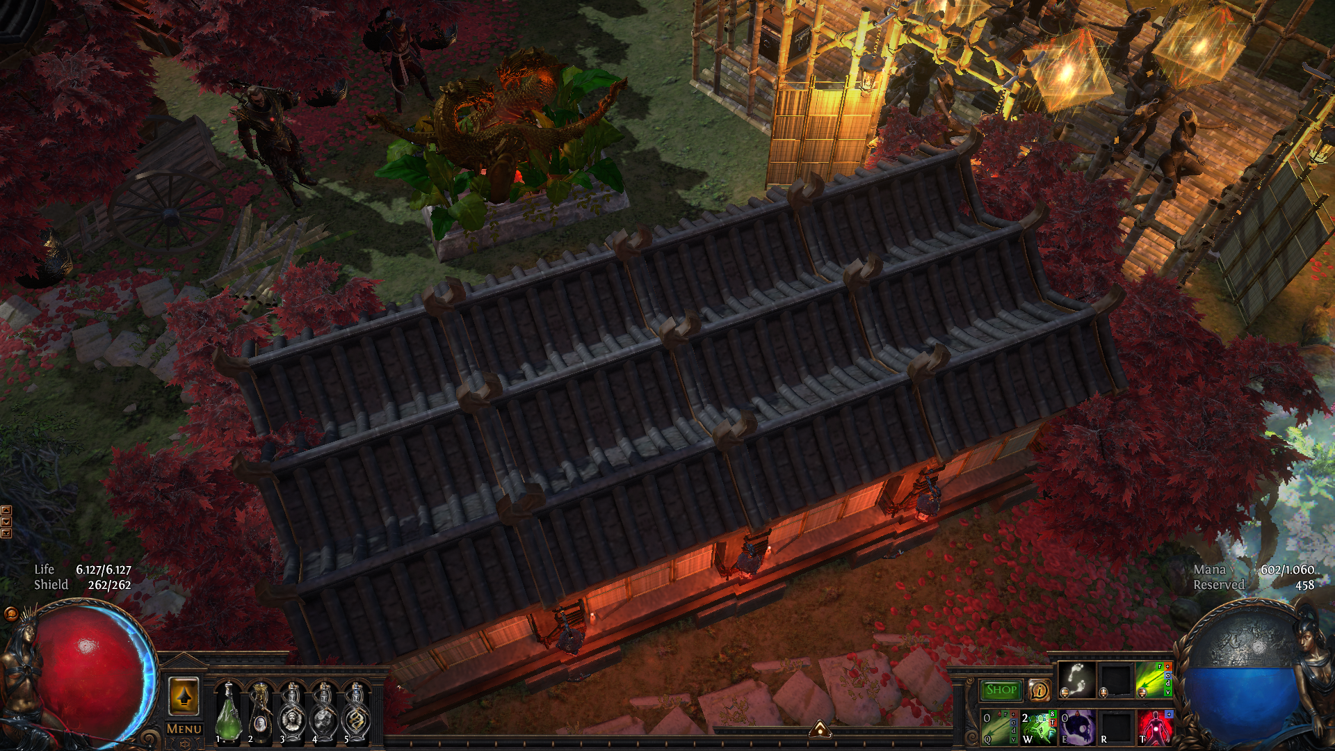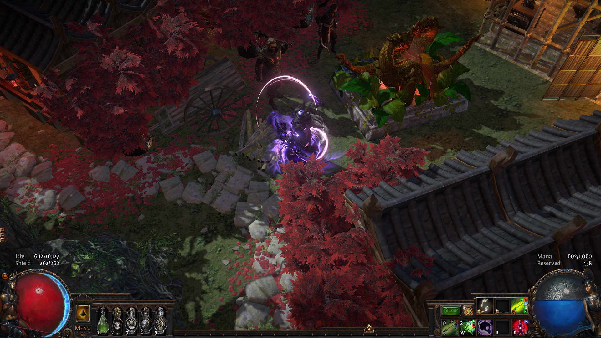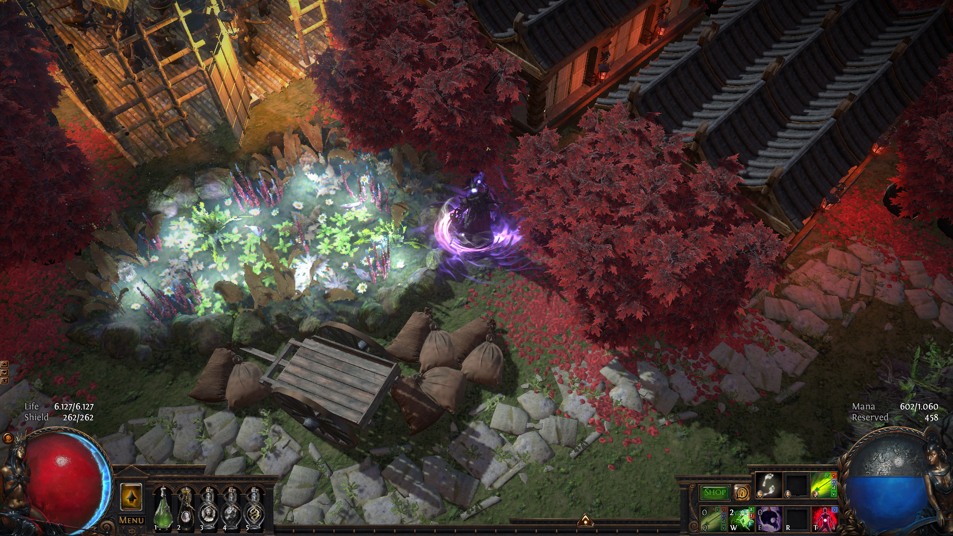 A japanese-themed village set in a gorgeous environment with several small ponds, maple trees, petals, a small path connecting everything and a central mapping area with everyting you need within short reach.
