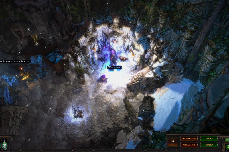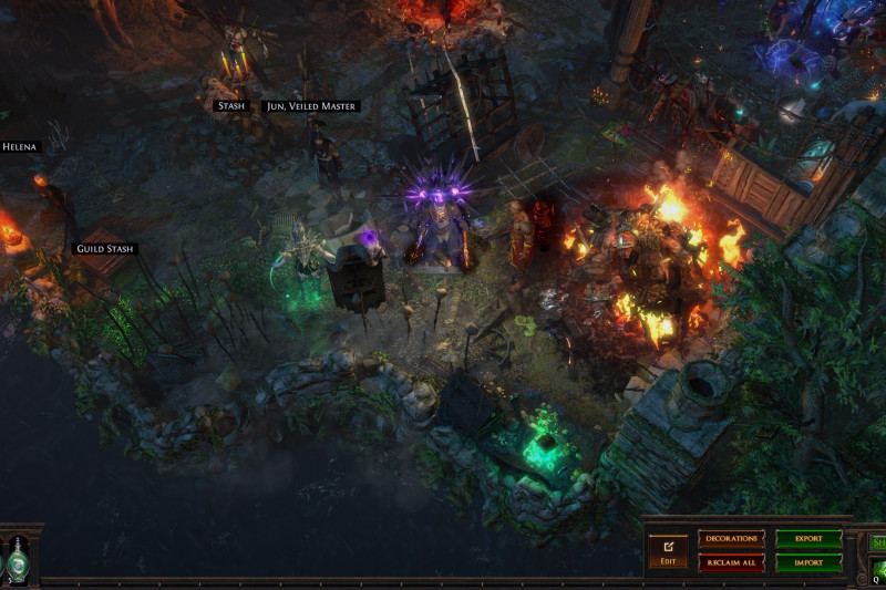 There are also microtransaction decorations here and there. Not to mention a ton of pets that I gathered through my time of playing PoE. So that little "zoo" area filled with pets may be empty when you import it. All I can help you with that is to advise you to remove the "zoo" and decorate that corner however you want, or remove decorations blocking the passage to the third area behind the "zoo" which I decorated mostly to be seen from the main area (stash + map device) and didn't intend to go there, so the area is WIP/unfinished.