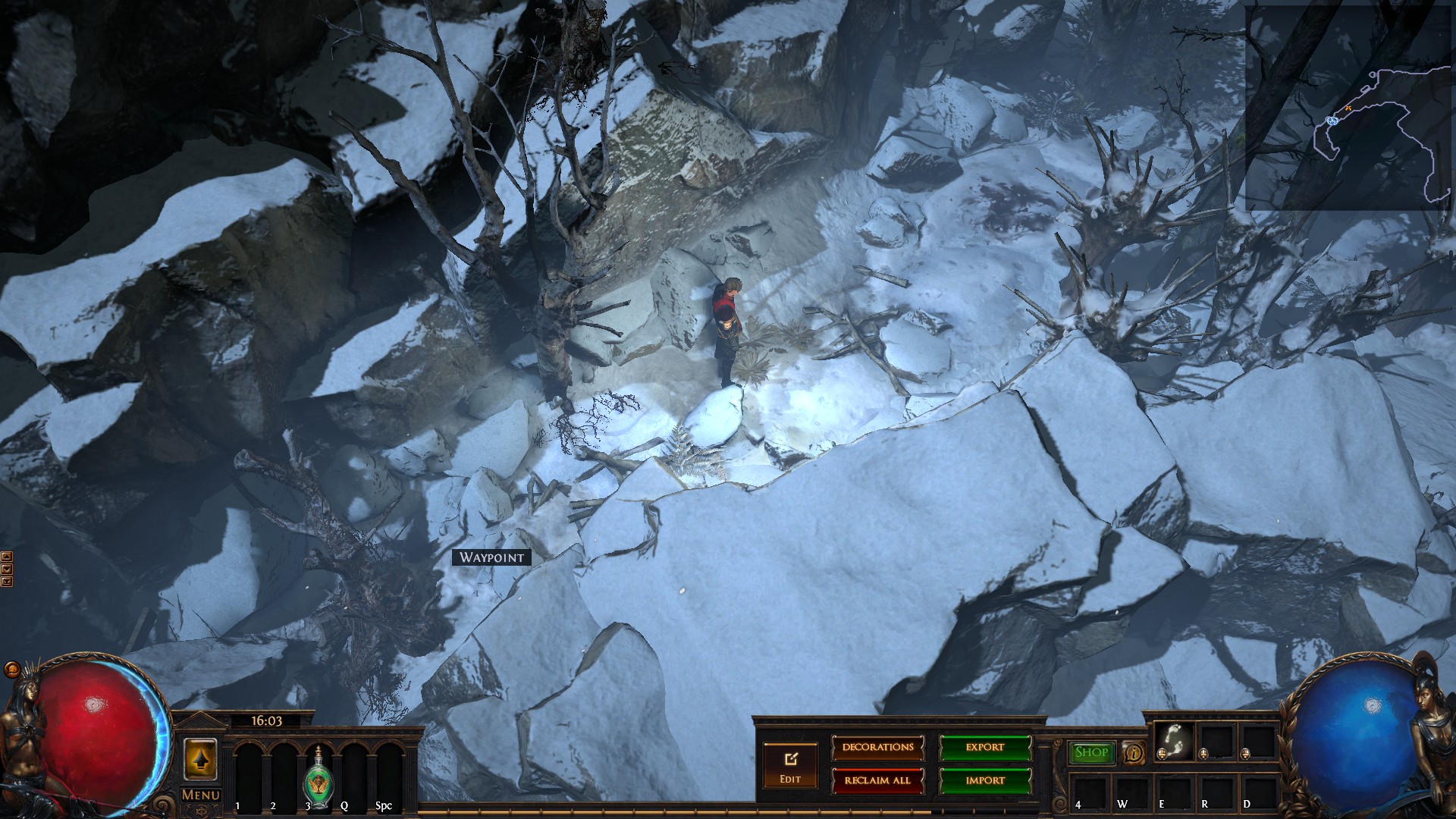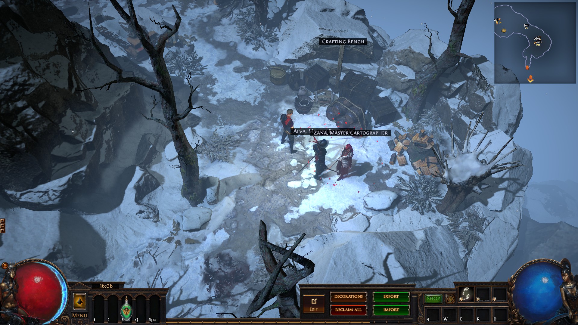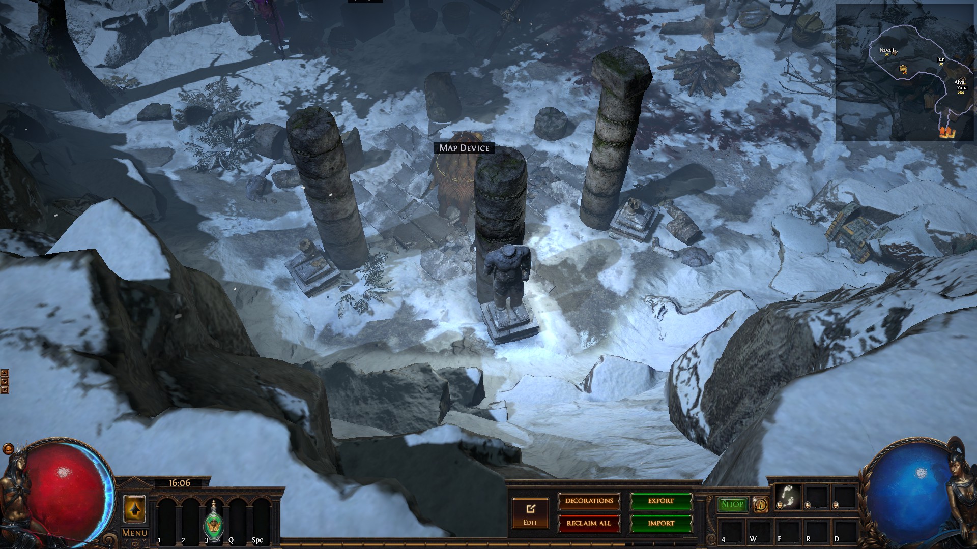 Hideout is divided in two - the forest area and the summit. Forest area does not contain anything but the Waypoint. The summit contains Crafting bench, Zana, Alva and Jun, all with good positions for theire portals. Near the tent, amidst the supplies, Navali and Stash are located. There you can place Guild Stash, if you're in one. Map divice located near the Stash and as for the portals, better to use those that are close to the ground and red-ish or any other that are bright. Falling snow and misterious white tint on these mountain create unnerving feeling of loneliness. Watch your step Exile and beware... there is something in the snow.