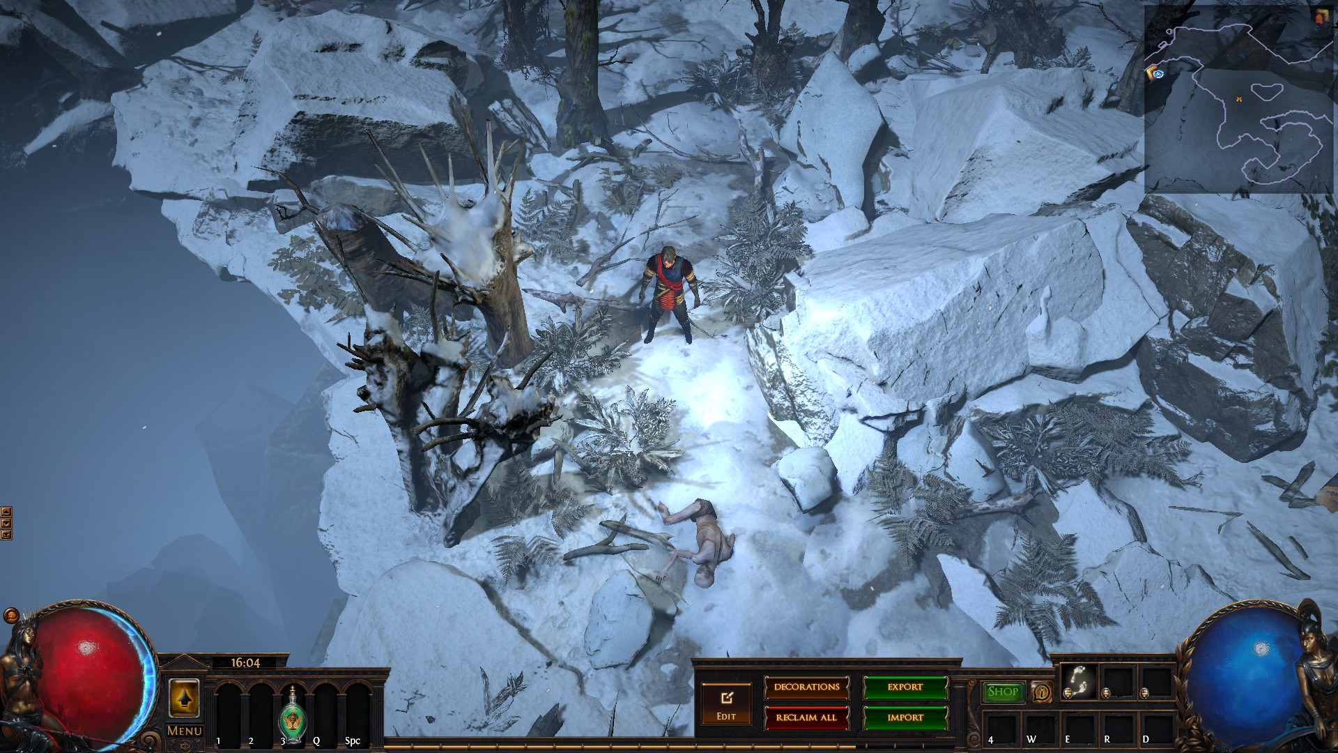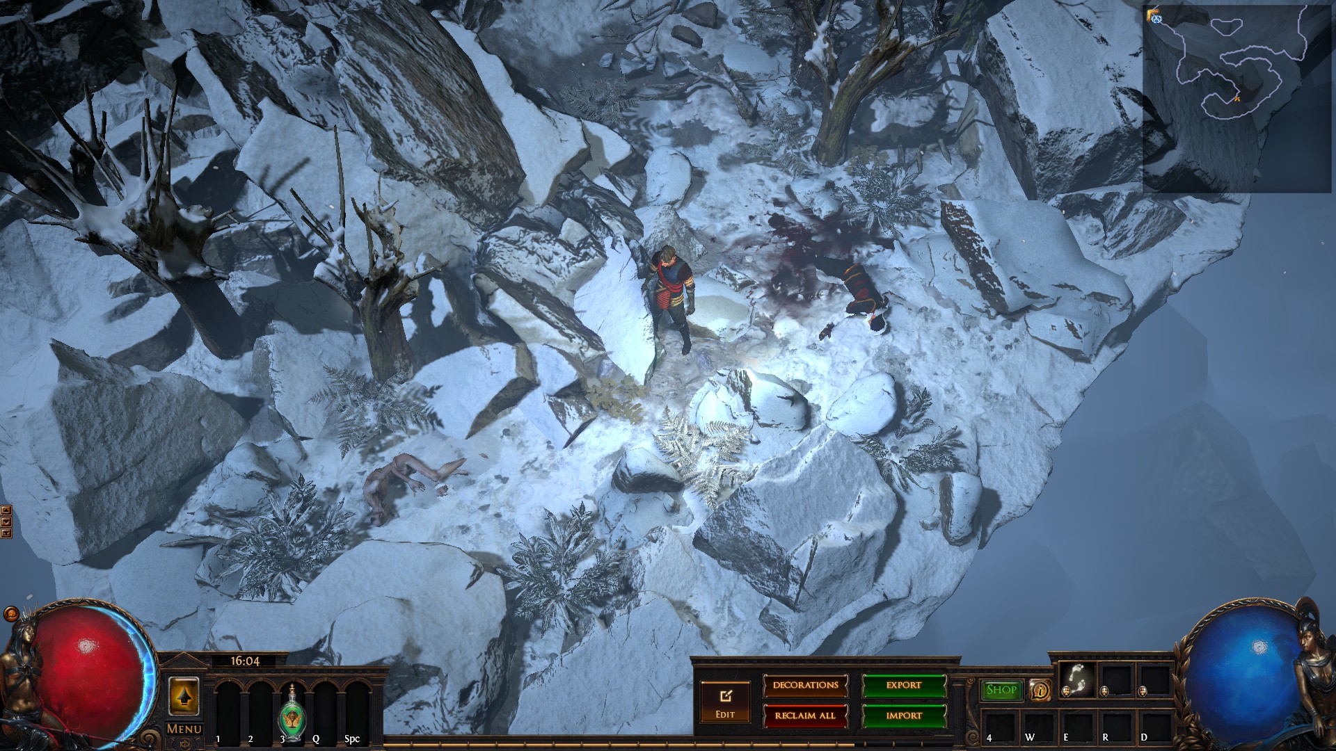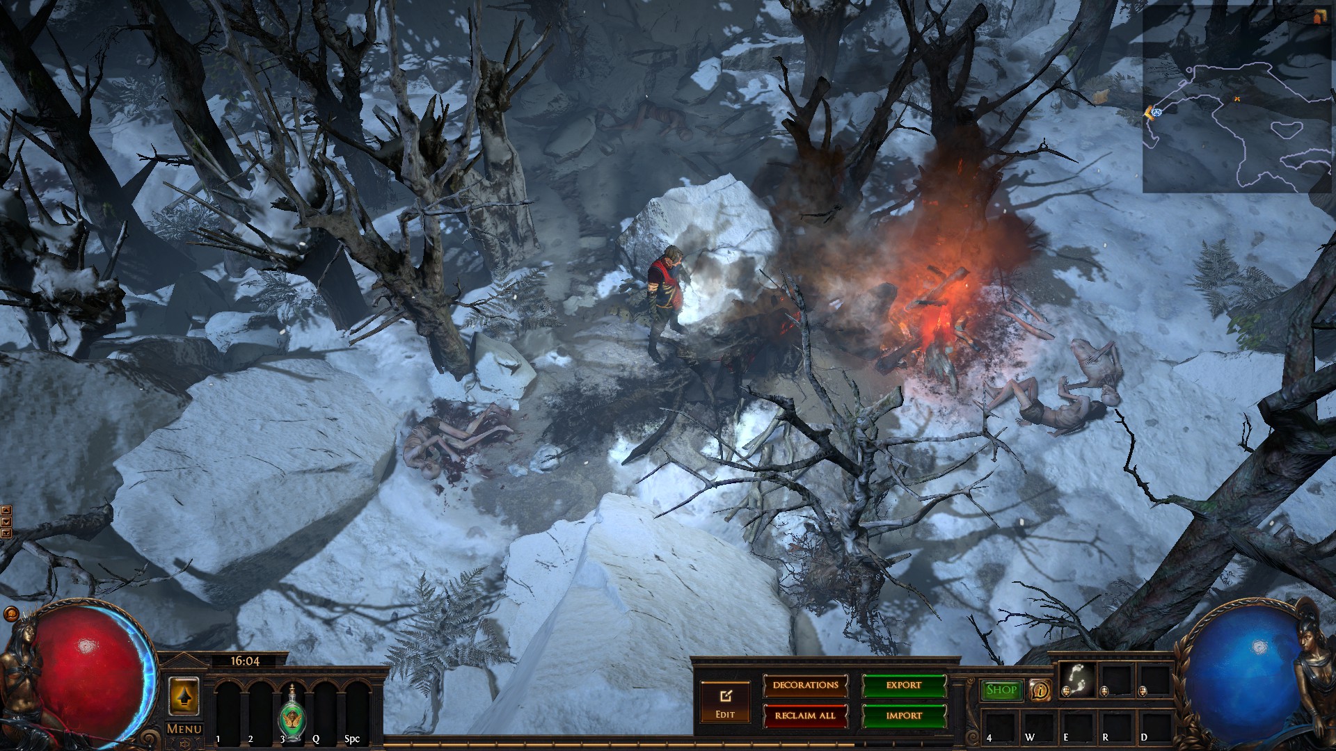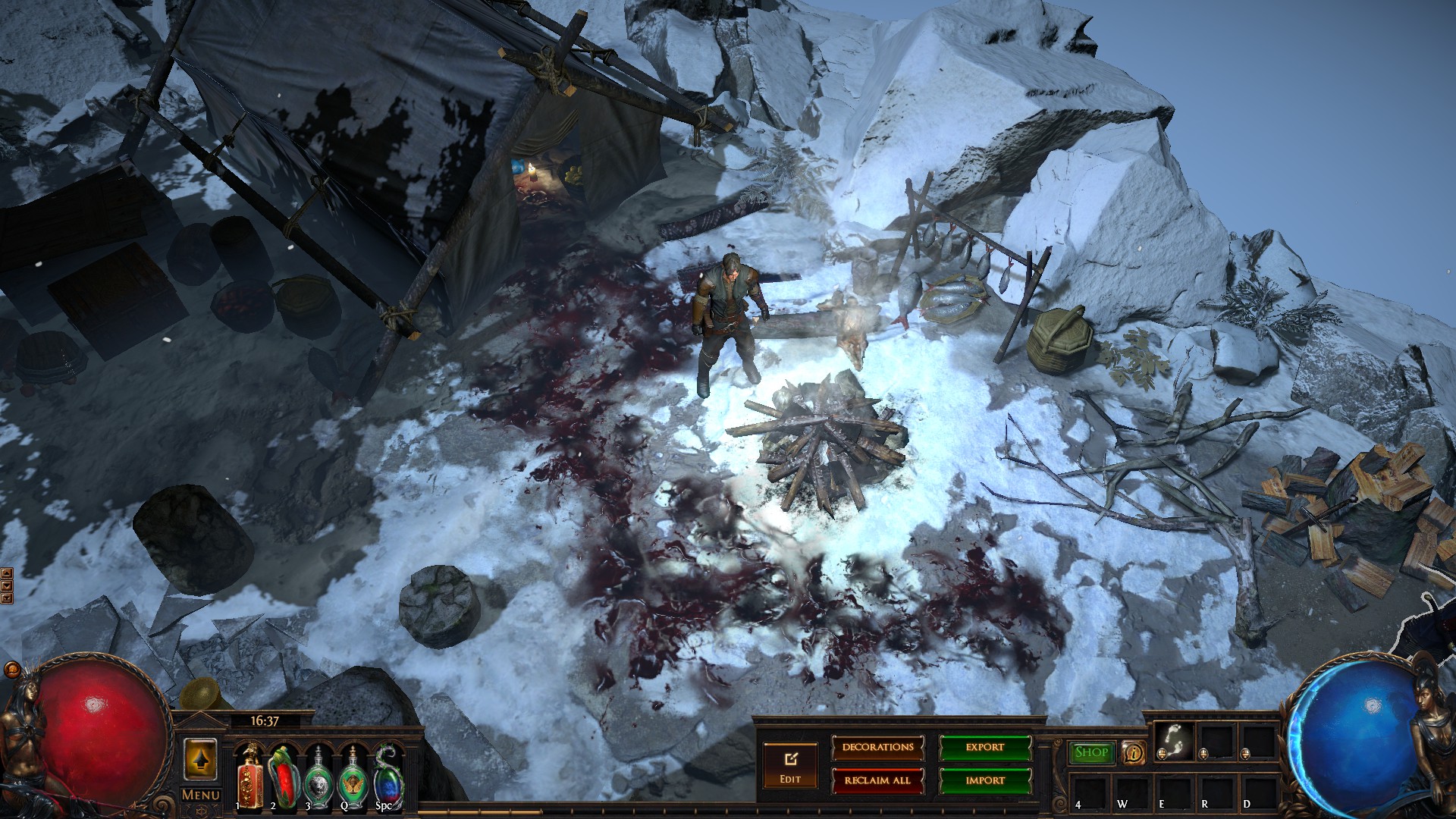 Hideout is divided in two - the forest area and the summit. Forest area does not contain anything but the Waypoint. The summit contains Crafting bench, Zana, Alva and Jun, all with good positions for theire portals. Near the tent, amidst the supplies, Navali and Stash are located. There you can place Guild Stash, if you're in one. Map divice located near the Stash and as for the portals, better to use those that are close to the ground and red-ish or any other that are bright. Falling snow and misterious white tint on these mountain create unnerving feeling of loneliness. Watch your step Exile and beware... there is something in the snow.