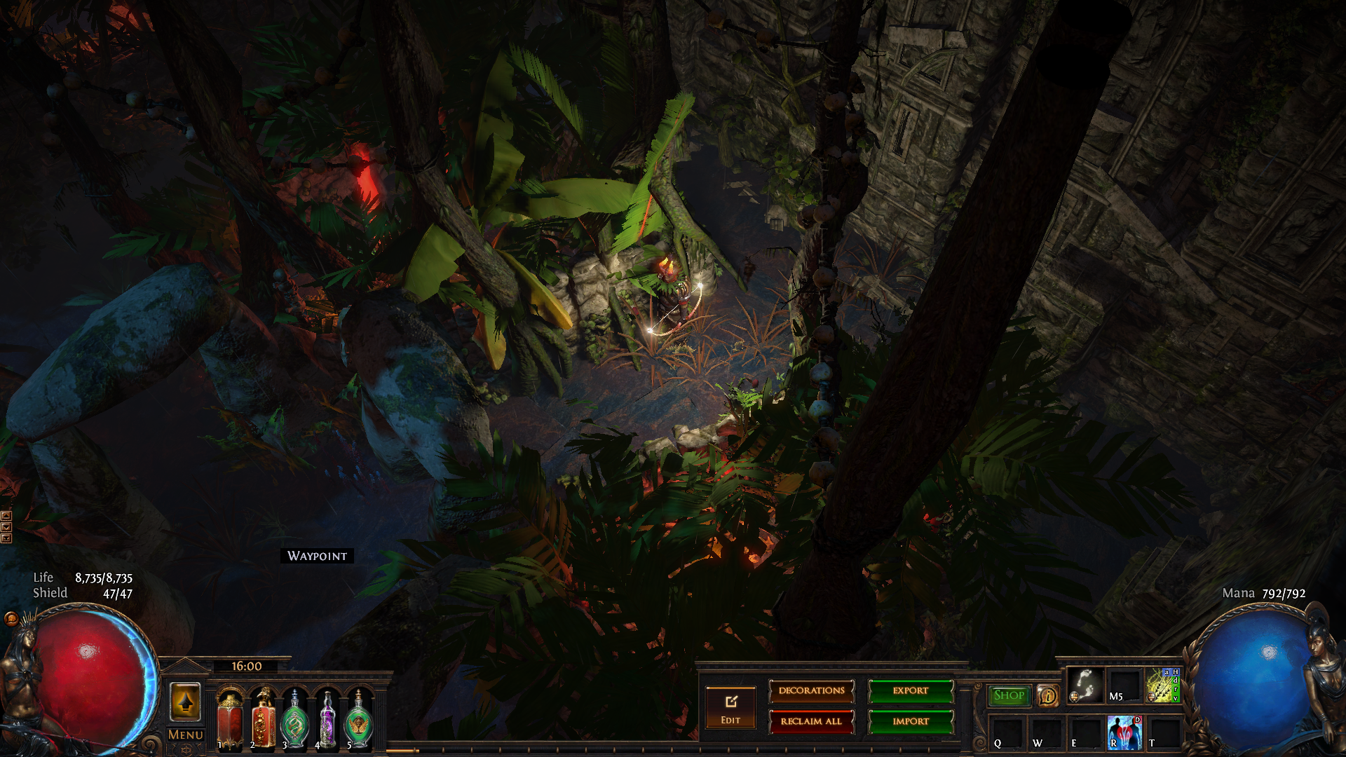 Dark theme hideout, with lots of trees, mushrooms and red light.