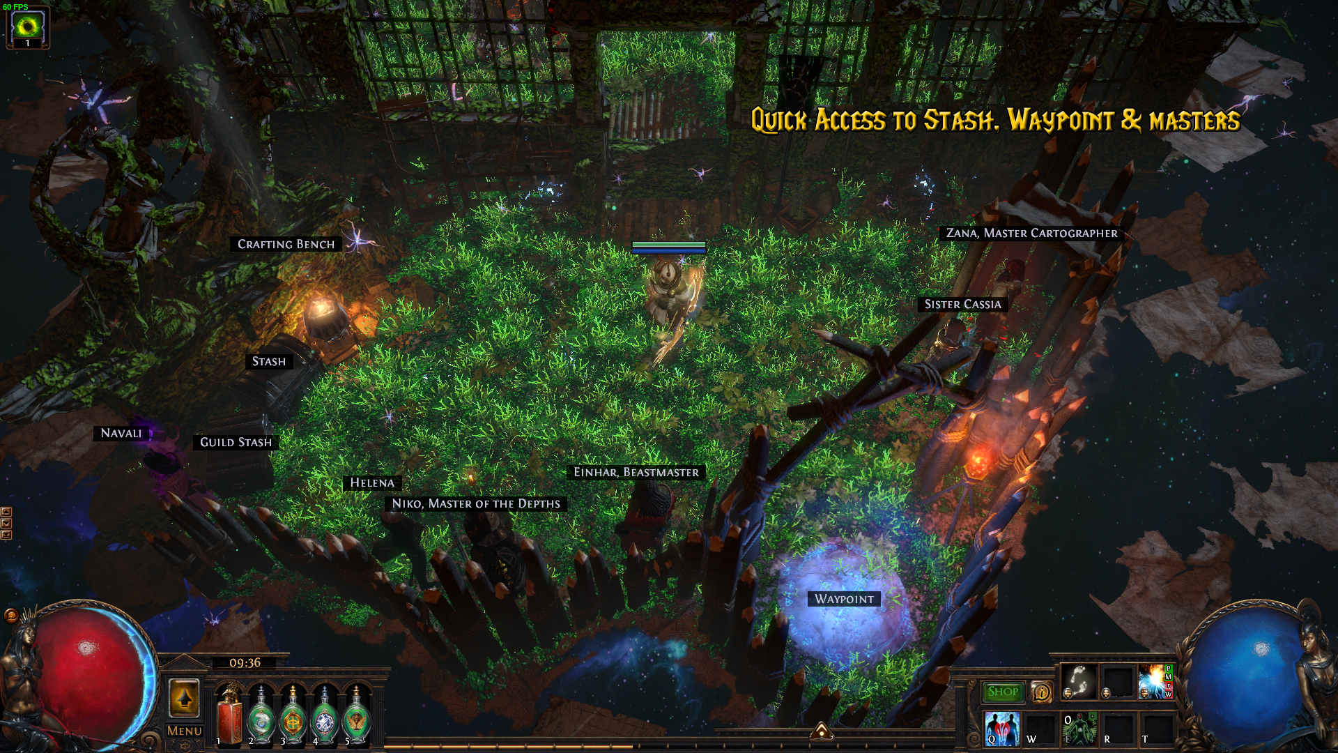 Designed to be detailed yet simplistic, with quick access to all the essentials in your hideout (map device, stash, waypoint, masters, crafting). You can even modify it to your needs, such as if you want the masters in a different location, or have the walls and statue not be overgrown (see: https://i.imgur.com/LfHBzLv.gif).